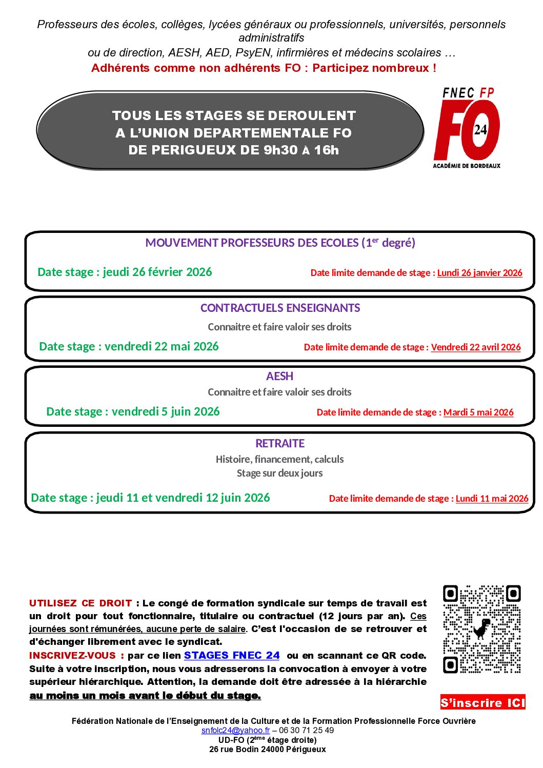 Chacun a droit à 12 jours de stage syndical par an. Ils ont lieu sur le temps scolaire. Ces stages à thématiques particulières sont le plus souvent dispensés à la Bourse du travail de Périgueux mais vous pouvez aussi participer aux stages proposés au niveau académique à Bordeaux.